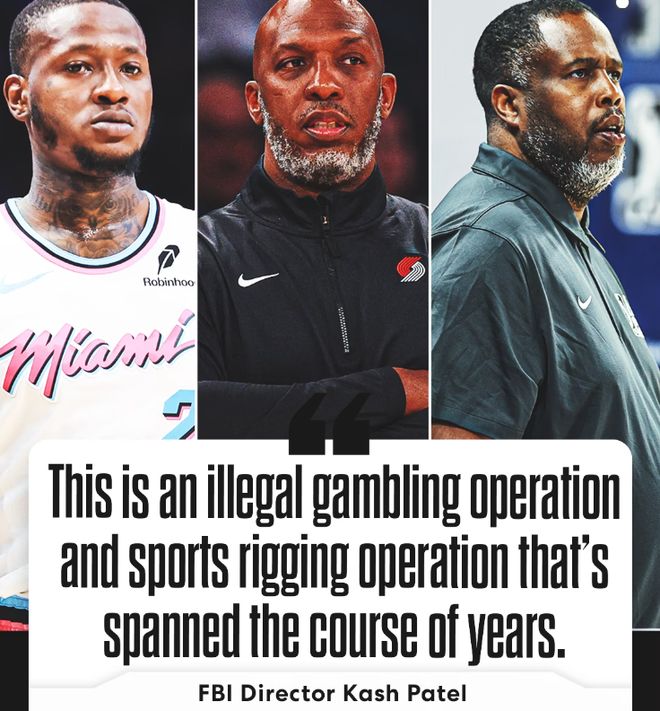 不过,杨瀚森首秀虽然打得艰难,但更艰难的还是赛后消息。据美媒ESPN的最新消息,FBI在近日的一场突击行动中,揭开了NBA近年来最大的涉赌丑闻——波特兰开拓者队主教练昌西·比卢普斯、迈阿密热火队后卫特里·罗齐尔与前NBA球员达蒙·琼斯被逮捕,一场波及全联盟、涉及多达31人的非法赌博网络浮出水面。