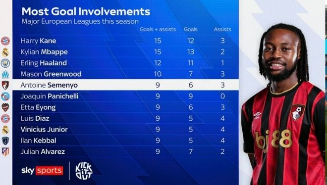 塞梅尼奥(伯恩茅斯)9(6球3助)